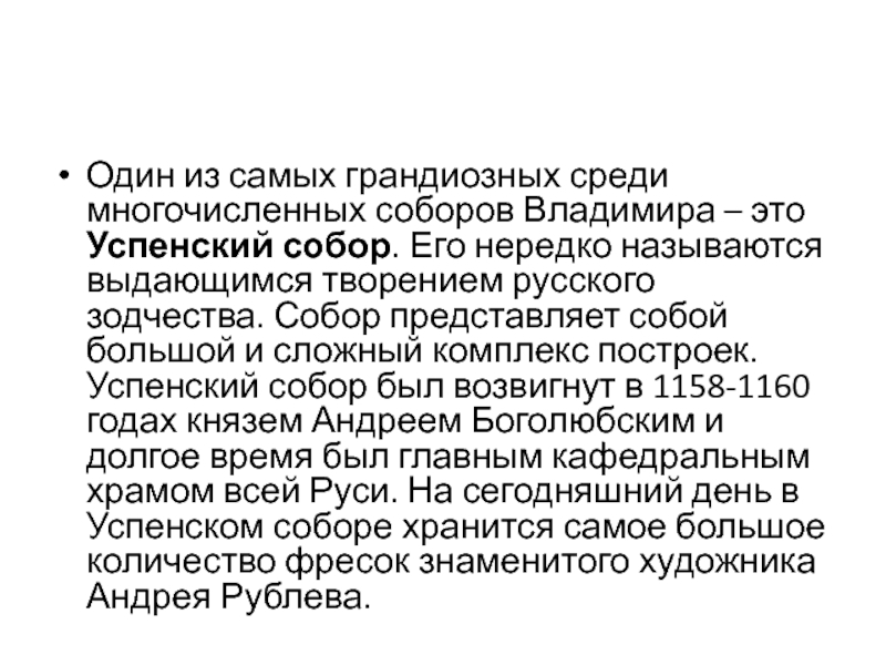 собор. Его нередко называются выдающимся творением русского зодчества. Собор представляет собой большой и сложный комплекс построек. Успенский собор был возвигнут в 1158-1160 годах князем Андреем Боголюбским и долгое время был главным кафедральным храмом всей Руси. На сегодняшний день в Успенском соборе хранится самое большое количество фресок знаменитого художника Андрея Рублева.