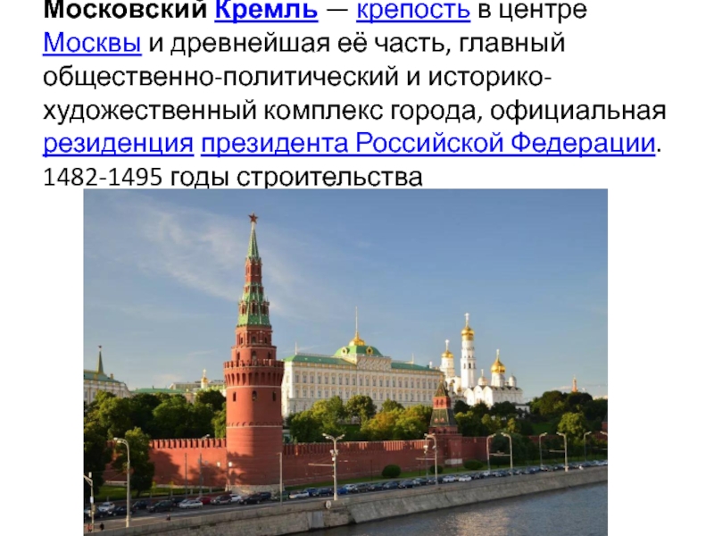 общественно-политический и историко-художественный комплекс города, официальная резиденция президента Российской Федерации. 1482-1495 годы строительства