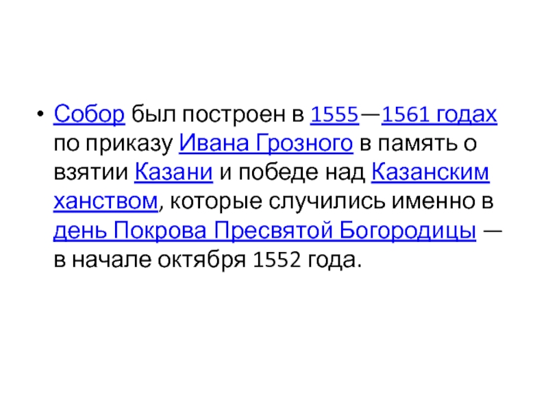 Слайд 40Собор был построен в 1555—1561 годах по приказу Ивана Грозного в