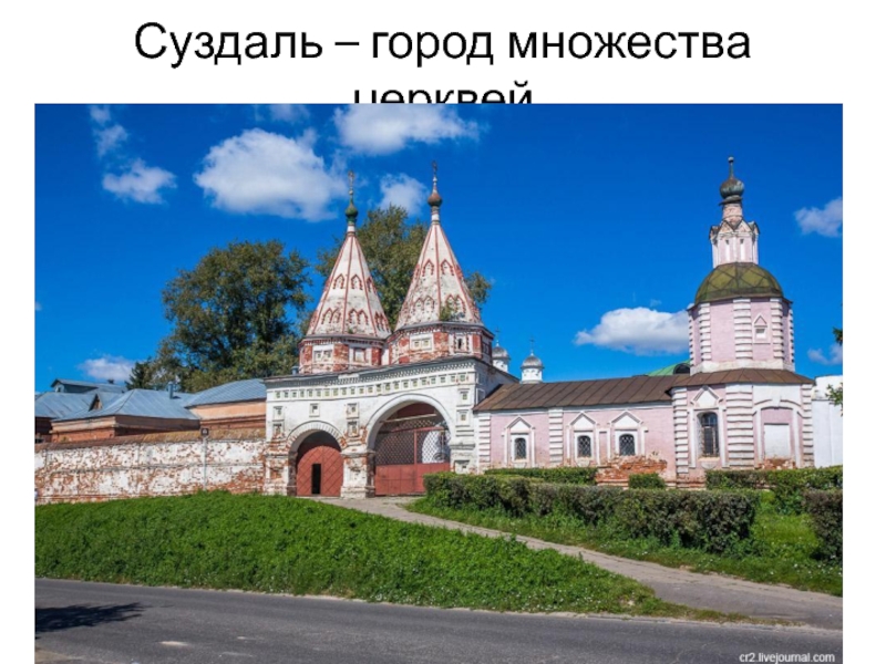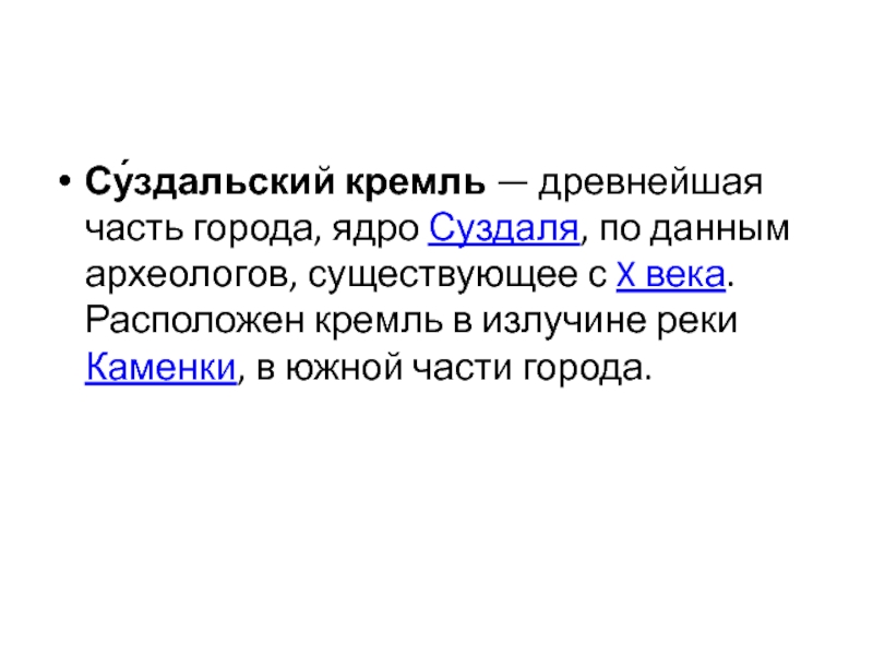Слайд 30Су́здальский кремль — древнейшая часть города, ядро Суздаля, по данным археологов, существующее