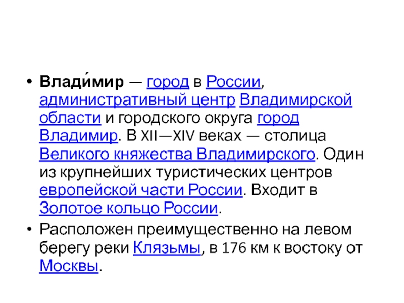 Слайд 20Влади́мир — город в России, административный центр Владимирской области и городского округа