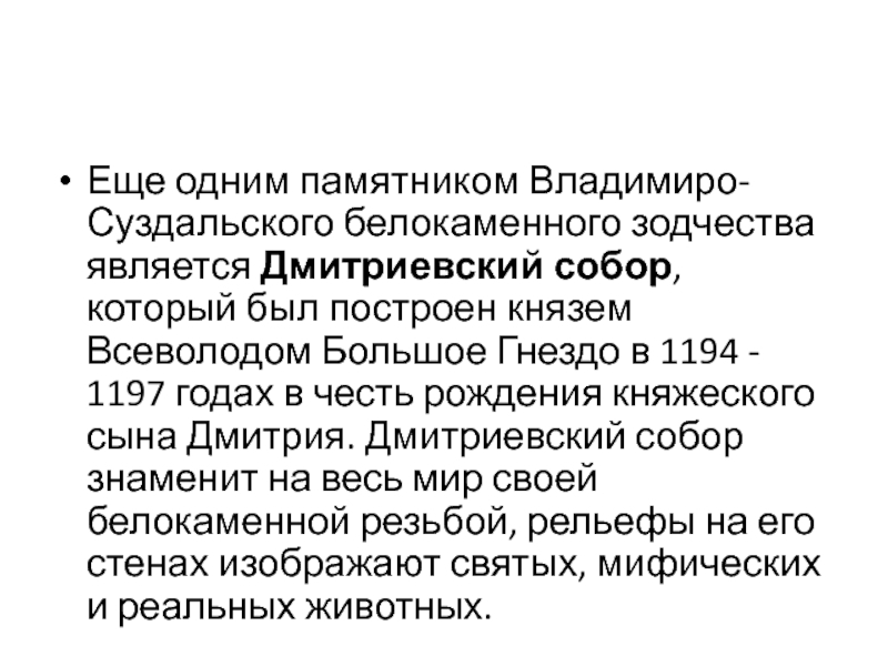 Слайд 27Еще одним памятником Владимиро-Суздальского белокаменного зодчества является Дмитриевский собор, который был
