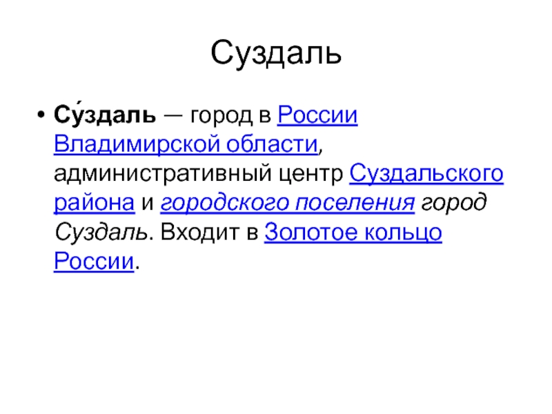 Су́здаль — город в России Владимирской области, административный центр Суздальского района и