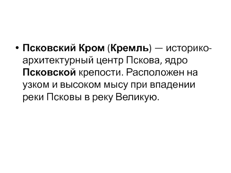Слайд 10Псковский Кром (Кремль) — историко-архитектурный центр Пскова, ядро Псковской крепости. Расположен