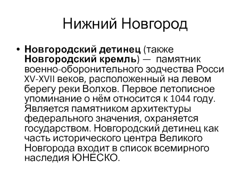 XV-XVII веков, расположенный на левом берегу реки Волхов. Первое летописное упоминание о нём относится к 1044 году. Является памятником архитектуры федерального значения, охраняется государством. Новгородский детинец как часть исторического центра Великого Новгорода входит в список всемирного наследия ЮНЕСКО.