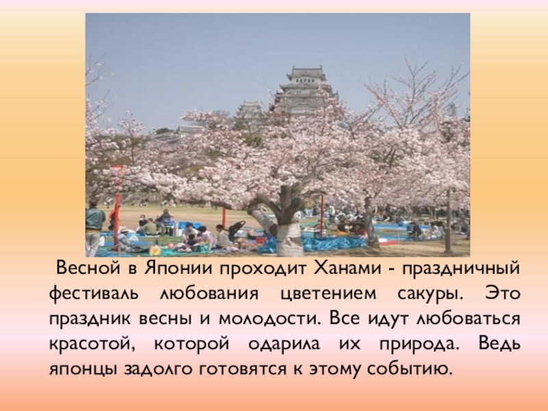 - праздничный фестиваль любования цветением сакуры. Это праздник весны и молодости. Все идут любоваться красотой, которой одарила их природа. Ведь японцы задолго готовятся к этому событию.