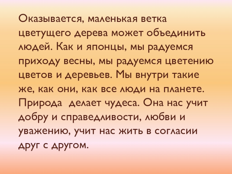 Слайд 15Оказывается, маленькая ветка цветущего дерева может объединить людей. Как и японцы,