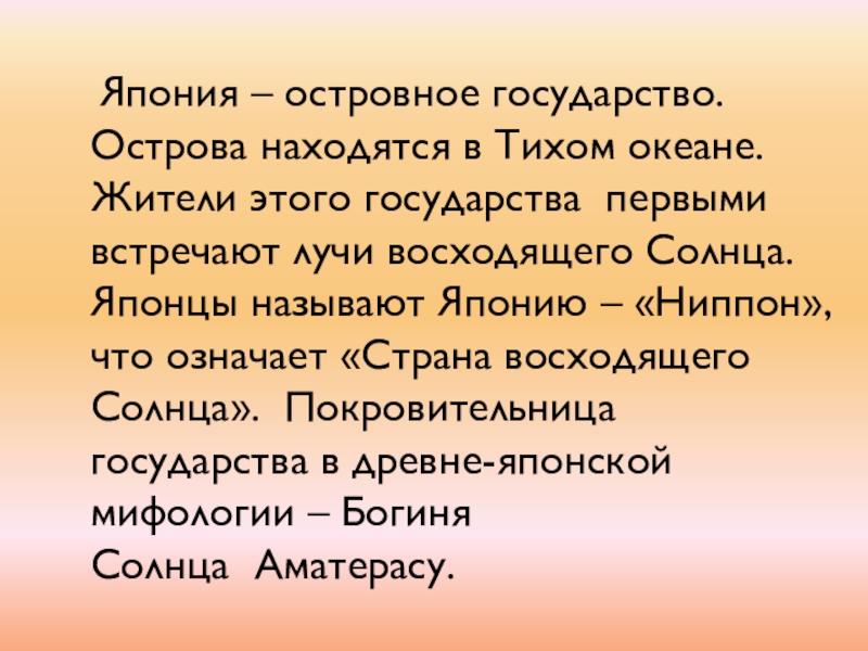 Япония – островное государство. Острова находятся в Тихом океане. Жители этого государства  первыми встречают лучи восходящего Солнца. Японцы называют Японию – «Ниппон», что означает «Страна восходящего Солнца».  Покровительница государства в древне-японской мифологии – Богиня