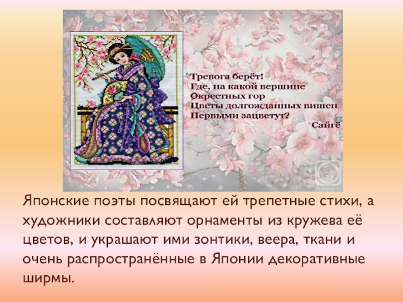 Слайд 10 Японские поэты посвящают ей трепетные стихи, а художники составляют орнаменты