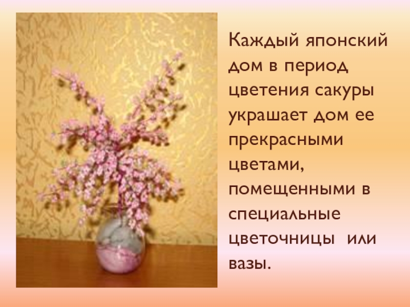 Каждый японский дом в период цветения сакуры украшает дом ее прекрасными цветами, помещенными в специальные   цветочницы