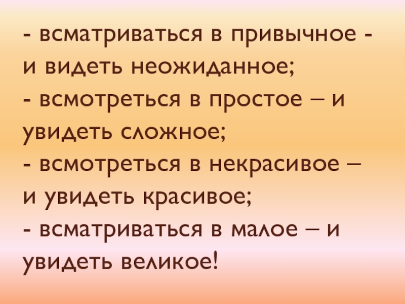 – и увидеть сложное; - всмотреться в некрасивое – и увидеть красивое; - всматриваться в малое – и увидеть великое!
