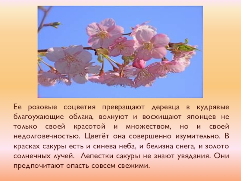 восхищают японцев не только своей красотой и множеством, но и своей недолговечностью. Цветёт она совершенно изумительно. В красках сакуры есть и синева неба, и белизна снега, и золото солнечных лучей. Лепестки сакуры не знают увядания. Они предпочитают опасть совсем свежими.