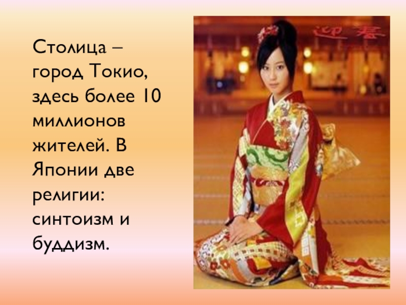 Столица – город Токио, здесь более 10 миллионов жителей. В Японии две религии: синтоизм и буддизм.