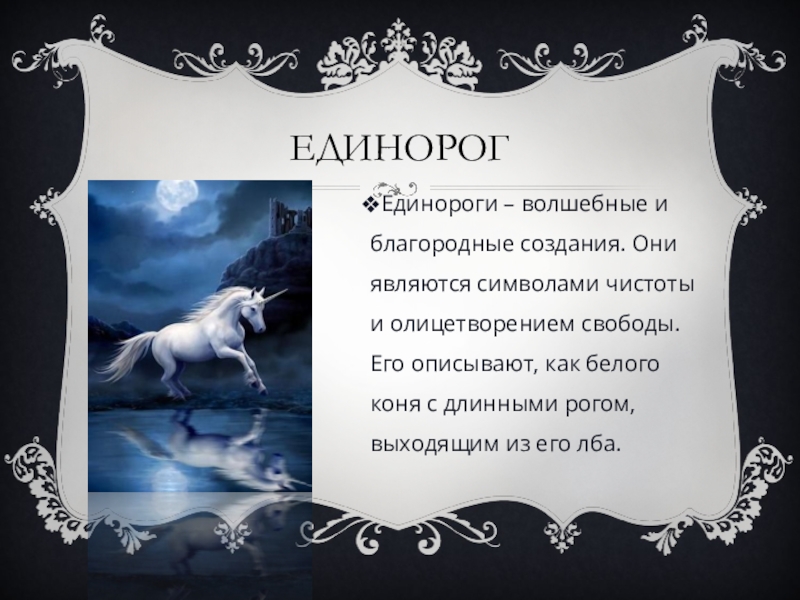 ЕдинорогЕдинороги – волшебные и благородные создания. Они являются символами чистоты и олицетворением свободы. Его описывают, как белого