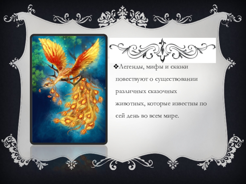 .Легенды, мифы и сказки повествуют о существовании различных сказочных животных, которые известны по сей день во всем мире.
