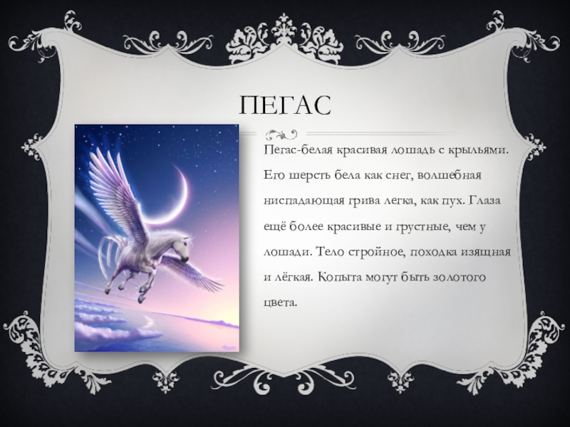пегасПегас-белая красивая лошадь с крыльями. Его шерсть бела как снег, волшебная ниспадающая грива легка, как пух. Глаза