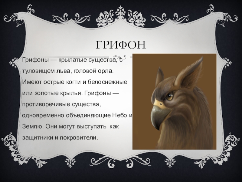 Грифоны — крылатые существа, с туловищем льва, головой орла. Имеют острые когти и белоснежные или