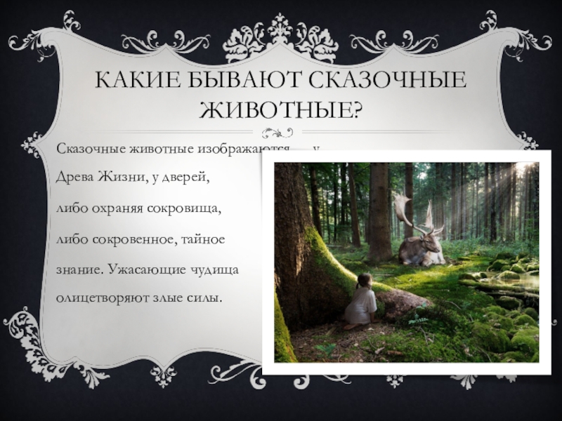 Какие бывают сказочные животные?Сказочные животные изображаются    у  Древа Жизни, у дверей, либо охраняя сокровища, либо сокровенное, тайное знание. Ужасающие чудища олицетворяют злые силы.