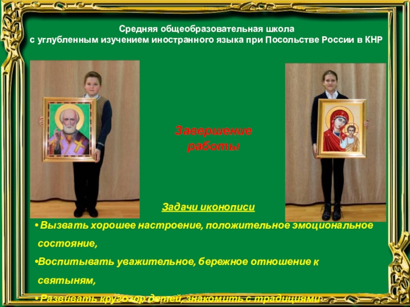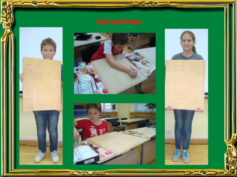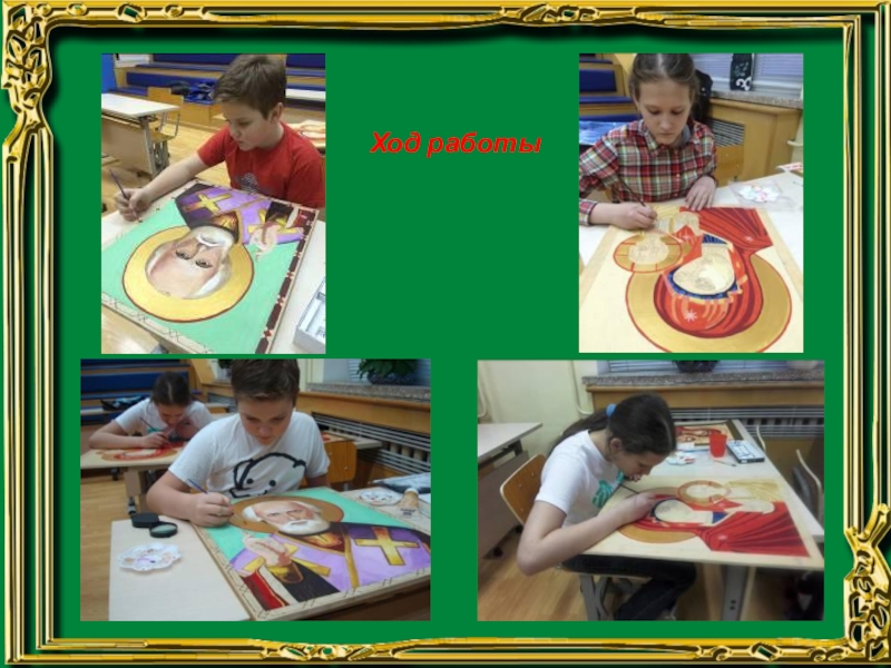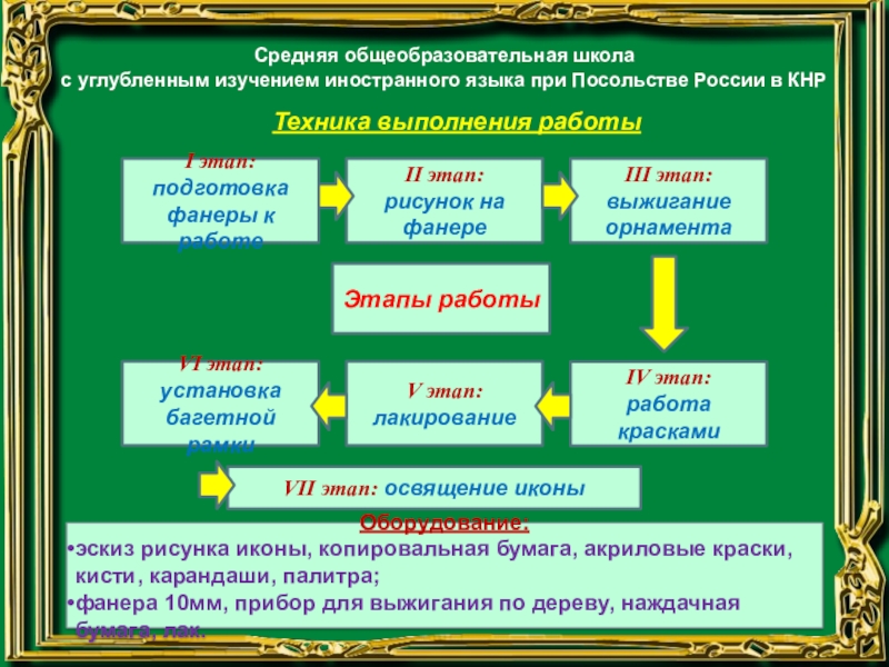 эскиз рисунка иконы, копировальная бумага, акриловые краски, кисти, карандаши, палитра;