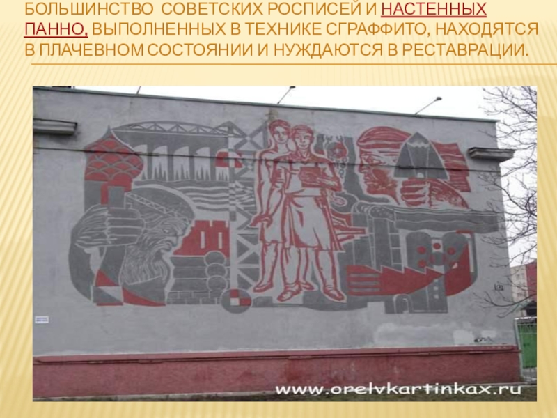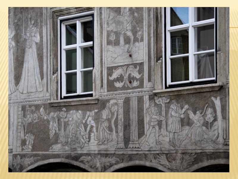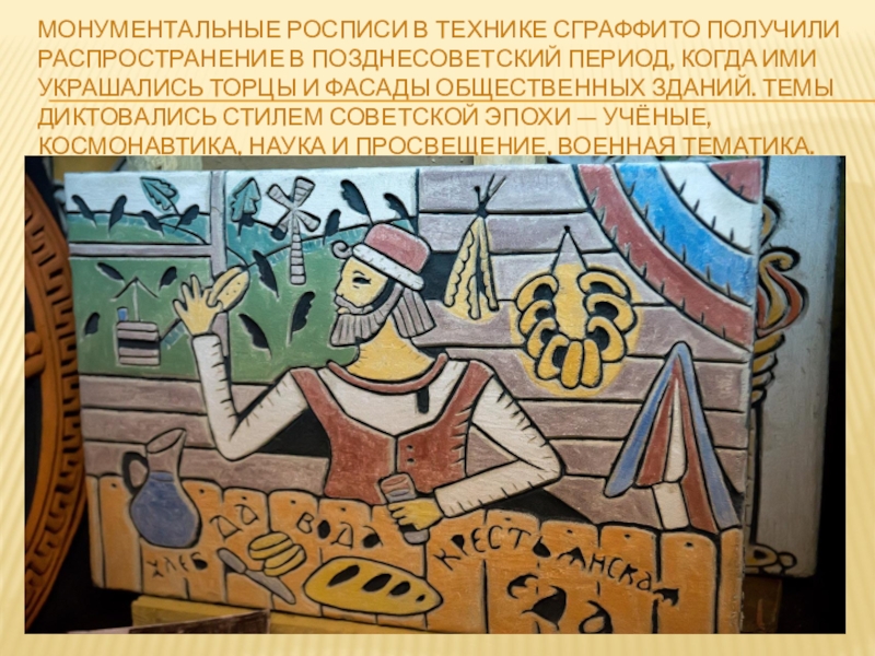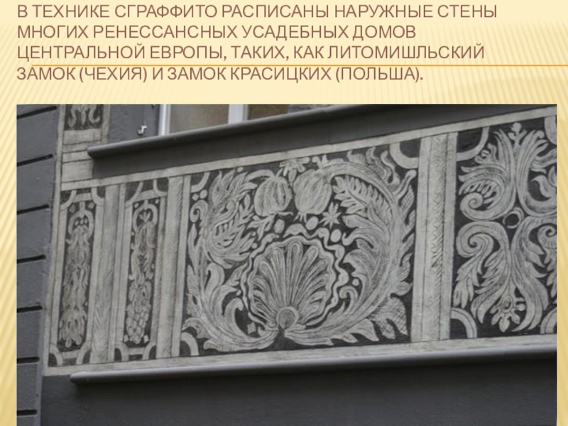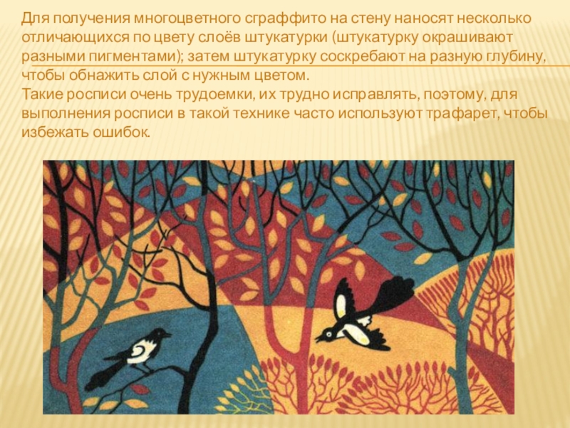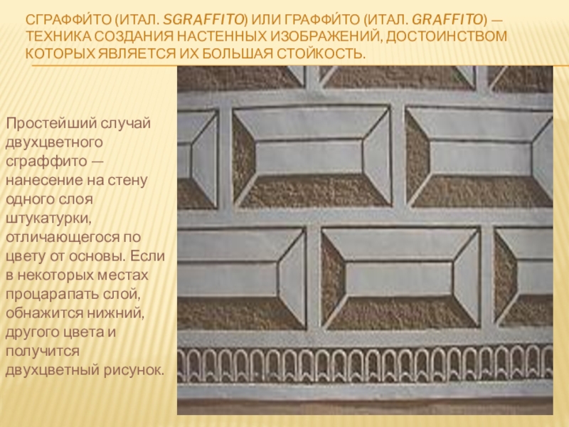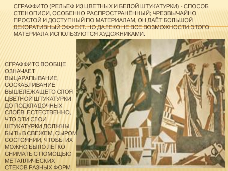 Сграффито вообще означает выцарапывание, соскабливание вышележащего слоя цветной штукатурки до подкладочных слоёв. Естественно, что эти слои штукатурки должны быть в свежем, сыром состоянии, чтобы их можно было легко снимать с помощью металлических стеков разных форм.