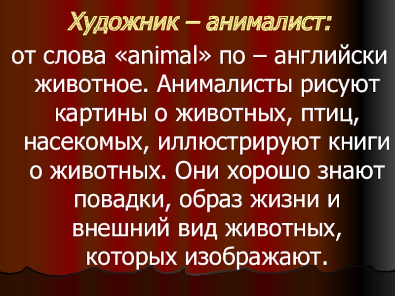 Художник – анималист: от слова «animal» по – английски животное. Анималисты рисуют картины о животных, птиц, насекомых,