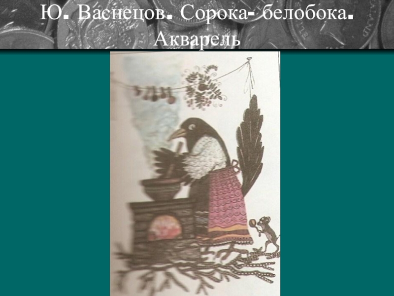 Слайд 18Ю. Васнецов. Сорока- белобока. Акварель