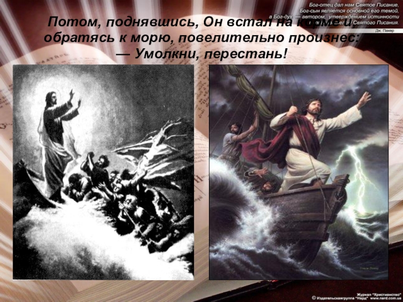 Слайд 7Потом, поднявшись, Он встал на корме и, обратясь к морю, повелительно