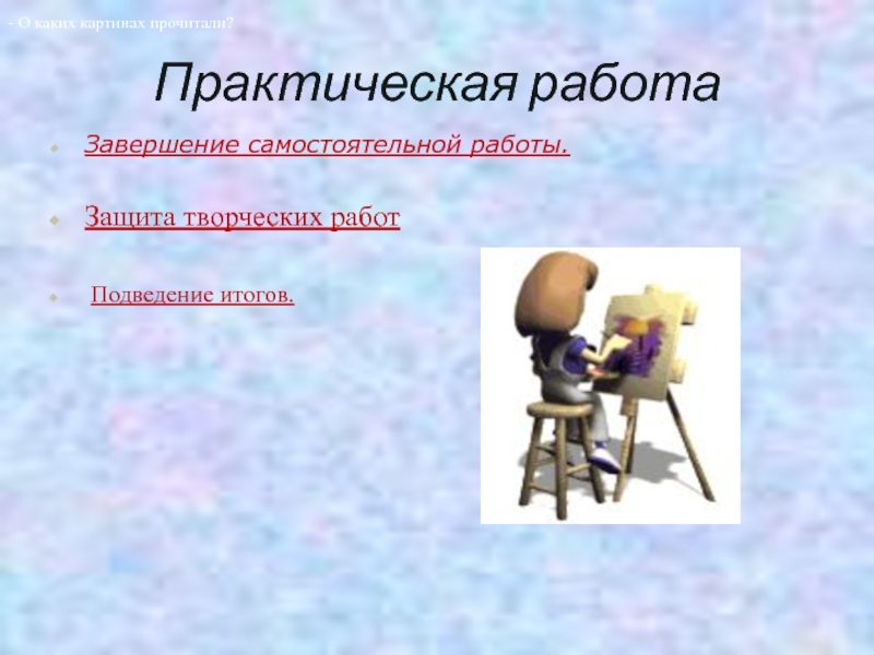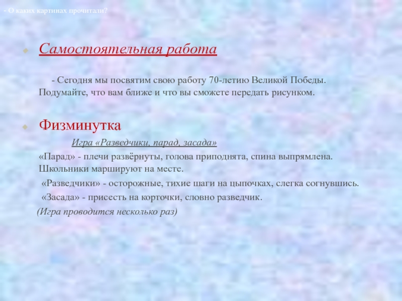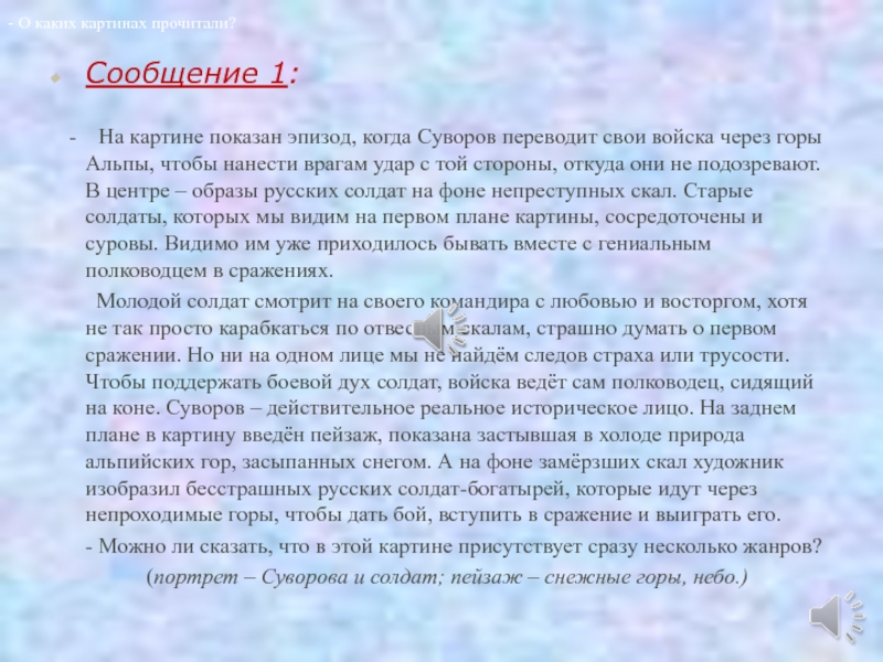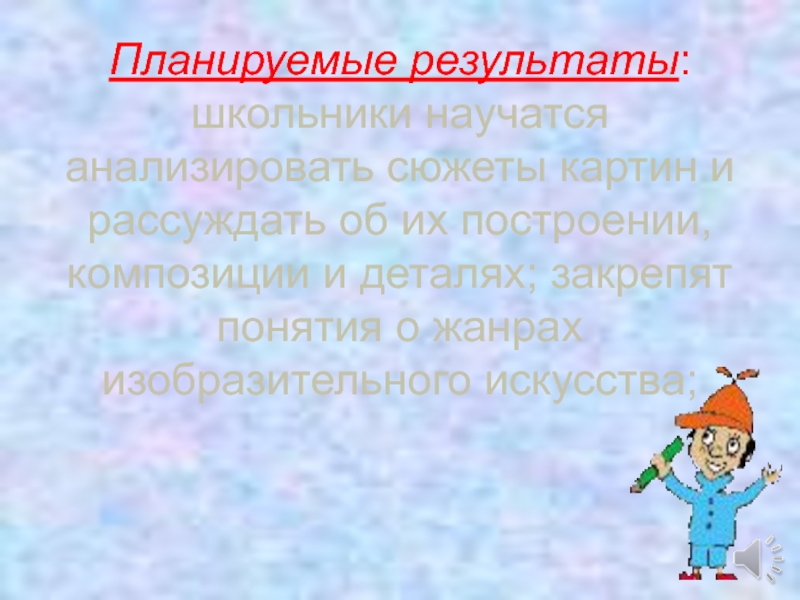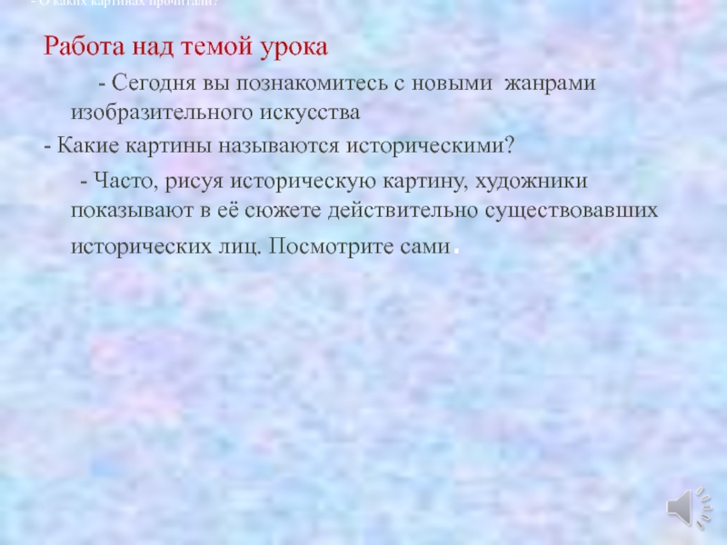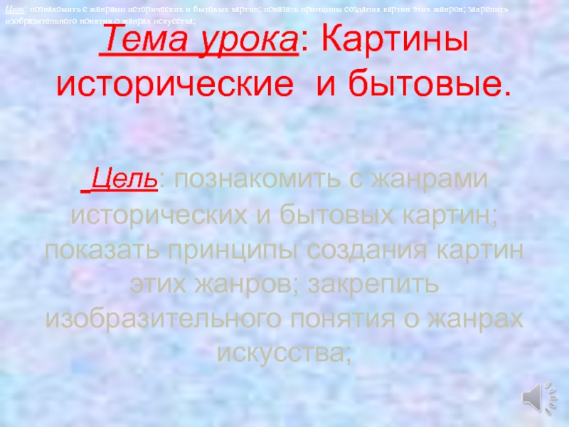 Цель: познакомить с жанрами исторических и бытовых картин; показать принципы создания картин этих жанров; закрепить изобразительного понятия о жанрах искусства;