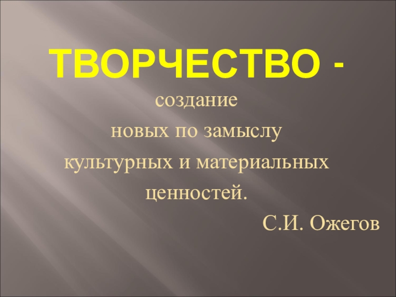 ТВОРЧЕСТВО - создание новых по замыслу культурных и материальных ценностей.С.И. Ожегов