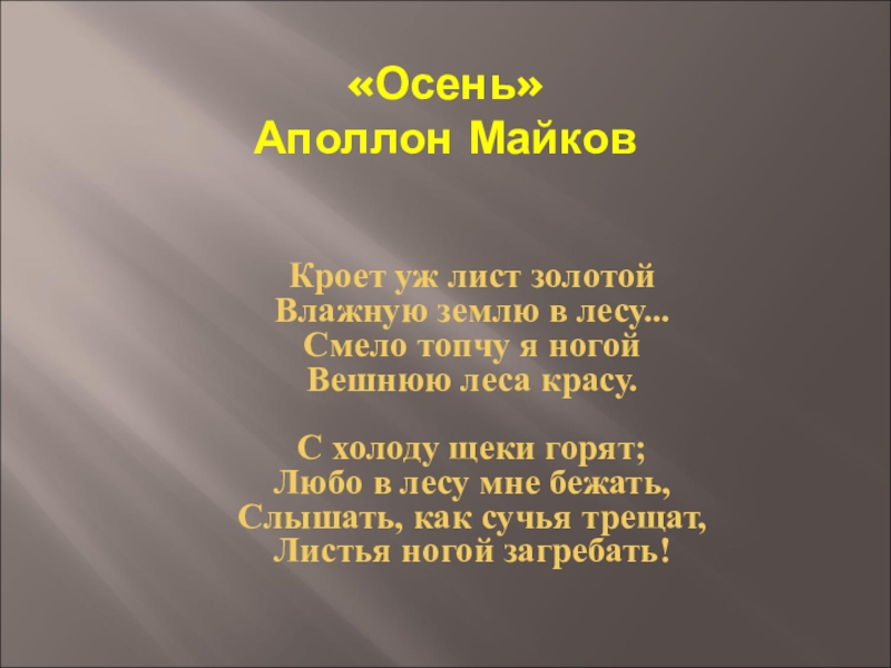 «Осень» Аполлон Майков   Кроет уж лист золотой Влажную землю в лесу... Смело топчу я ногой