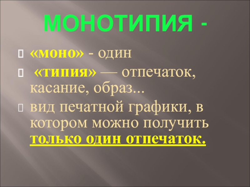 МОНОТИПИЯ -«моно» - один «типия» — отпечаток, касание, образ... вид печатной графики, в котором можно получить только