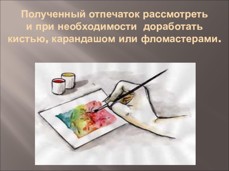 Слайд 16Полученный отпечаток рассмотреть и при необходимости доработать кистью, карандашом или фломастерами.