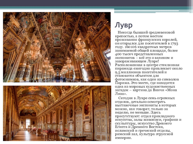 королей, он открылся для посетителей в 1793 году. 160106 квадратных метров занимаемой общей площади, более 400 тысяч представленных экспонатов – всё это о великом и завораживающем Лувре! Расположенная в центре стеклянная пирамида ежегодно привлекает около 9,5 миллионов посетителей и становится объектом для фотоснимков, как один из символов Парижа. Это место, где находится одна из мировых художественных загадок – картина да Винчи «Мона Лиза».
