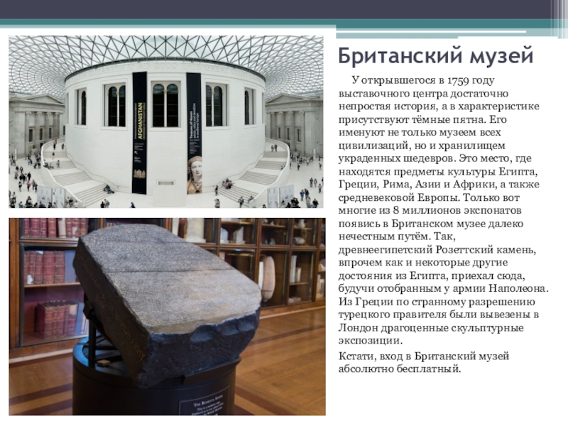 достаточно непростая история, а в характеристике присутствуют тёмные пятна. Его именуют не только музеем всех цивилизаций, но и хранилищем украденных шедевров. Это место, где находятся предметы культуры Египта, Греции, Рима, Азии и Африки, а также средневековой Европы. Только вот многие из 8 миллионов экспонатов появись в Британском музее далеко нечестным путём. Так, древнеегипетский Розеттский камень, впрочем как и некоторые другие достояния из Египта, приехал сюда, будучи отобранным у армии Наполеона. Из Греции по странному разрешению турецкого правителя были вывезены в Лондон драгоценные скульптурные экспозиции.