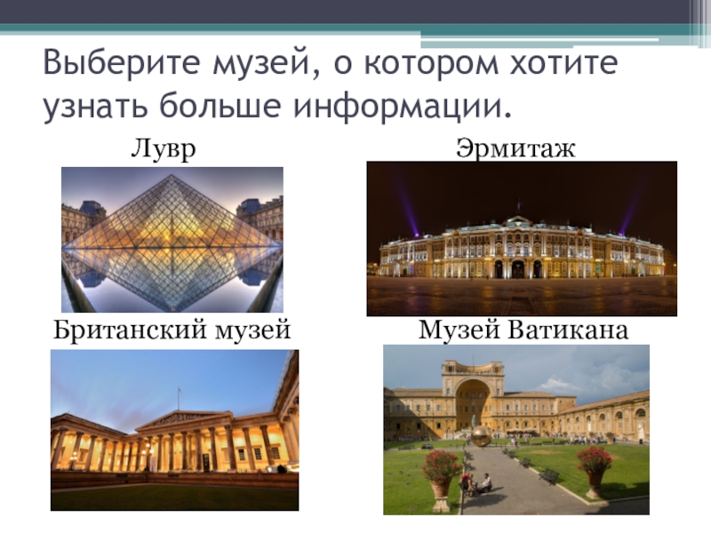 Слайд 2Выберите музей, о котором хотите узнать больше информации.