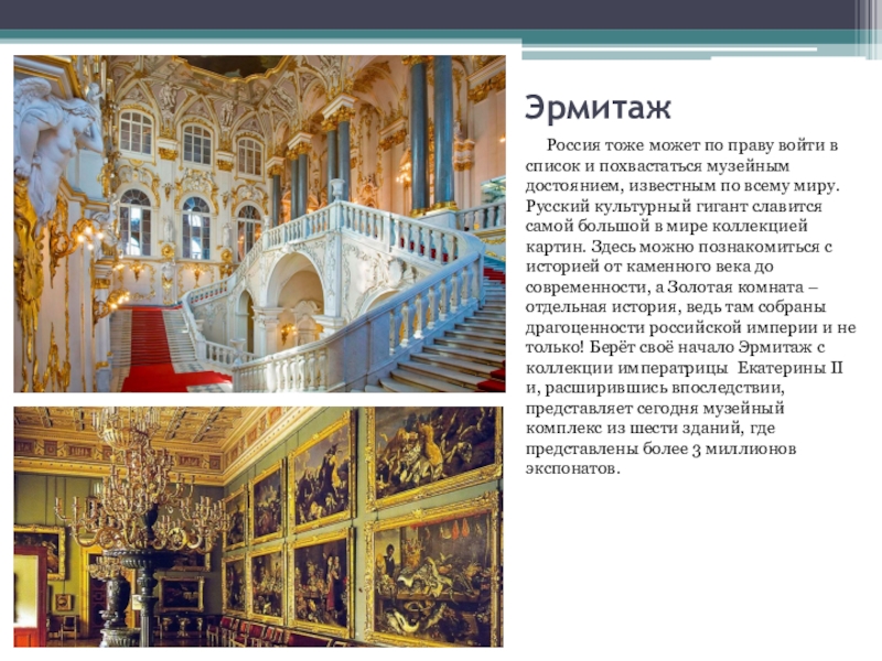 и похвастаться музейным достоянием, известным по всему миру. Русский культурный гигант славится самой большой в мире коллекцией картин. Здесь можно познакомиться с историей от каменного века до современности, а Золотая комната – отдельная история, ведь там собраны драгоценности российской империи и не только! Берёт своё начало Эрмитаж с коллекции императрицы Екатерины II и, расширившись впоследствии, представляет сегодня музейный комплекс из шести зданий, где представлены более 3 миллионов экспонатов.