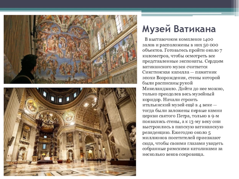 50 000 объектов. Готовьтесь пройти около 7 километров, чтобы осмотреть все представленные экспонаты. Сердцем ватиканского музея считается Сикстинская капелла — памятник эпохи Возрождения, стены которой были расписаны рукой Микеланджело. Дойти до нее можно, только преодолев весь музейный коридор. Начали строить итальянский музей ещё в 4 веке — тогда были заложены первые камни церкви святого Петра, только в 9-м появились стены, а к 13-му веку они выстроились в папскую ватиканскую резиденцию. Ежегодно около 5 миллионов посетителей приезжают сюда, чтобы своими глазами увидеть собранные римскими католиками за несколько веков сокровища.