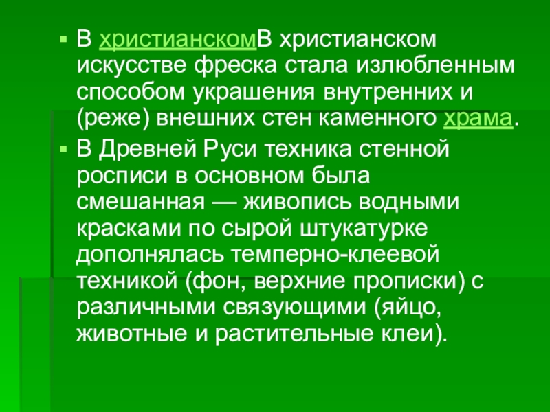 В христианскомВ христианском искусстве фреска стала излюбленным способом украшения внутренних и