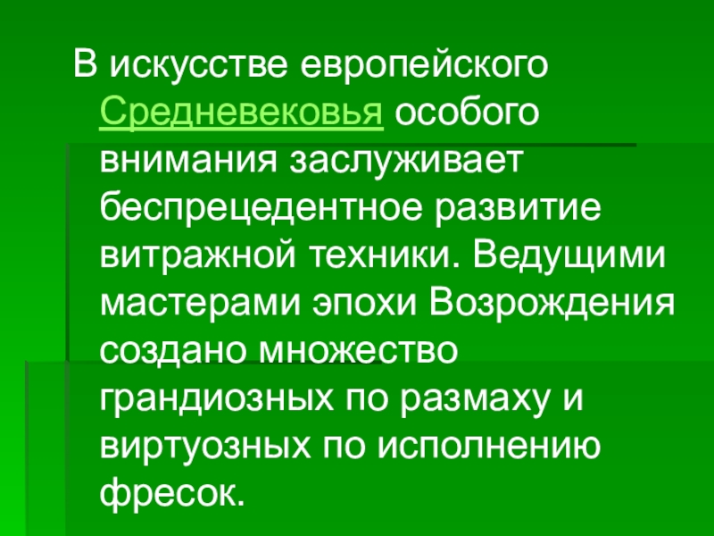 В искусстве европейского Средневековья особого внимания заслуживает беспрецедентное развитие витражной техники.