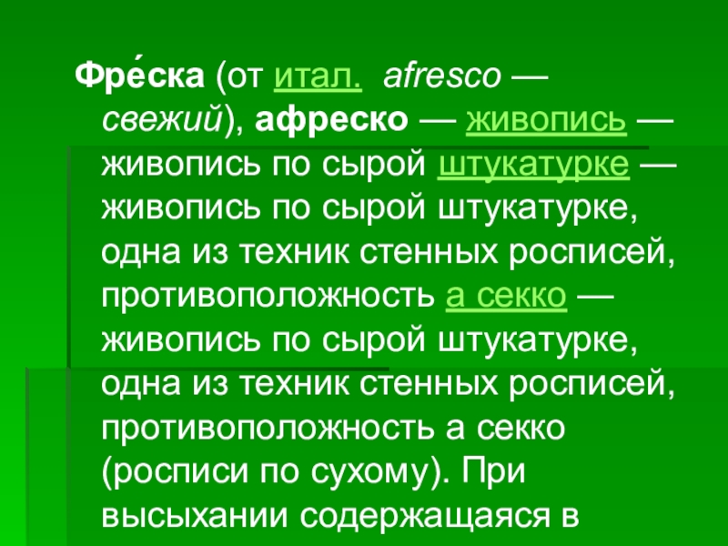 живопись по сырой штукатурке, одна из техник стенных росписей, противоположность а секко — живопись по сырой штукатурке, одна из техник стенных росписей, противоположность а секко (росписи по сухому). При высыхании содержащаяся в штукатурке известь — живопись по сырой штукатурке, одна из техник стенных росписей, противоположность а секко (росписи по сухому). При высыхании содержащаяся в штукатурке известь образует тонкую прозрачную кальциевую плёнку, делающую фреску долговечной.
