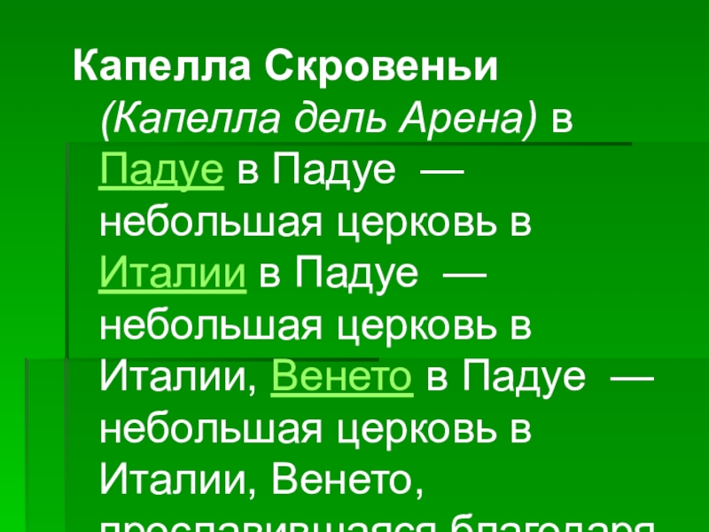 церковь в Италии в Падуе — небольшая церковь в Италии, Венето в Падуе — небольшая церковь в Италии, Венето, прославившаяся благодаря фресковому в Падуе — небольшая церковь в Италии, Венето, прославившаяся благодаря фресковому циклу работы Джотто.