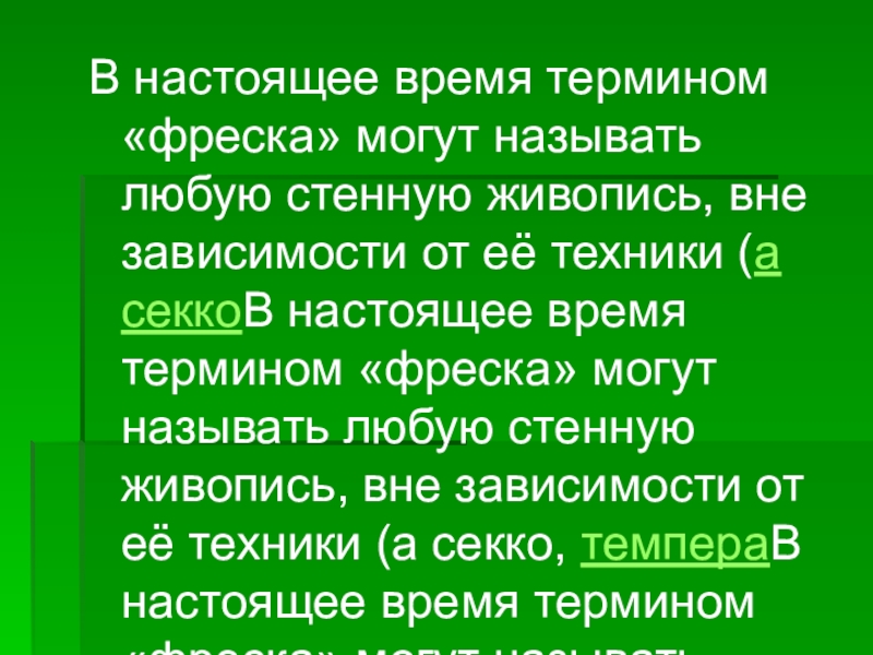зависимости от её техники (а секкоВ настоящее время термином «фреска» могут называть любую стенную живопись, вне зависимости от её техники (а секко, темпераВ настоящее время термином «фреска» могут называть любую стенную живопись, вне зависимости от её техники (а секко, темпера, живопись масляными, акриловыми красками и т. д.)