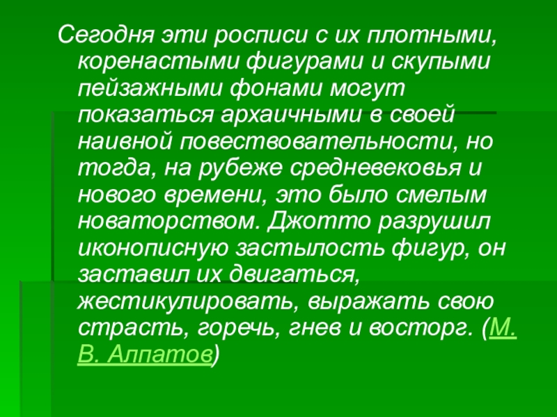 фонами могут показаться архаичными в своей наивной повествовательности, но тогда, на рубеже средневековья и нового времени, это было смелым новаторством. Джотто разрушил иконописную застылость фигур, он заставил их двигаться, жестикулировать, выражать свою страсть, горечь, гнев и восторг. (М.В. Алпатов)