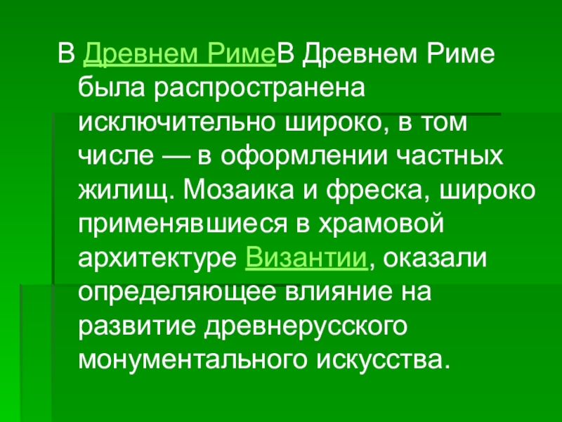 числе — в оформлении частных жилищ. Мозаика и фреска, широко применявшиеся в храмовой архитектуре Византии, оказали определяющее влияние на развитие древнерусского монументального искусства.