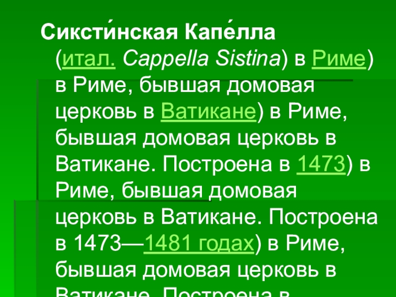 в Ватикане) в Риме, бывшая домовая церковь в Ватикане. Построена в 1473) в Риме, бывшая домовая церковь в Ватикане. Построена в 1473—1481 годах) в Риме, бывшая домовая церковь в Ватикане. Построена в 1473—1481 годах архитектором Джордже де Дольчи) в Риме, бывшая домовая церковь в Ватикане. Построена в 1473—1481 годах архитектором Джордже де Дольчи, по заказу папы римского) в Риме, бывшая домовая церковь в Ватикане. Построена в 1473—1481 годах архитектором Джордже де Дольчи, по заказу папы римского Сикста IV, отсюда и название.