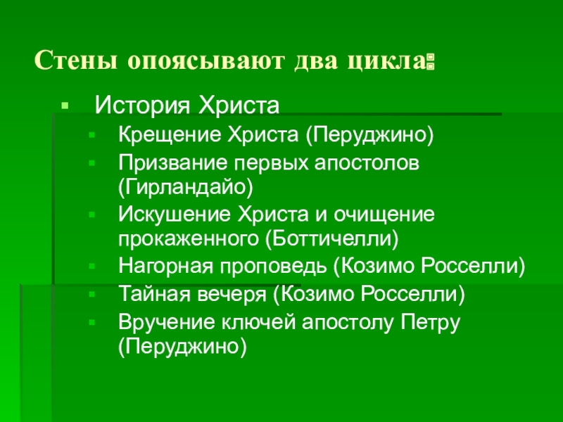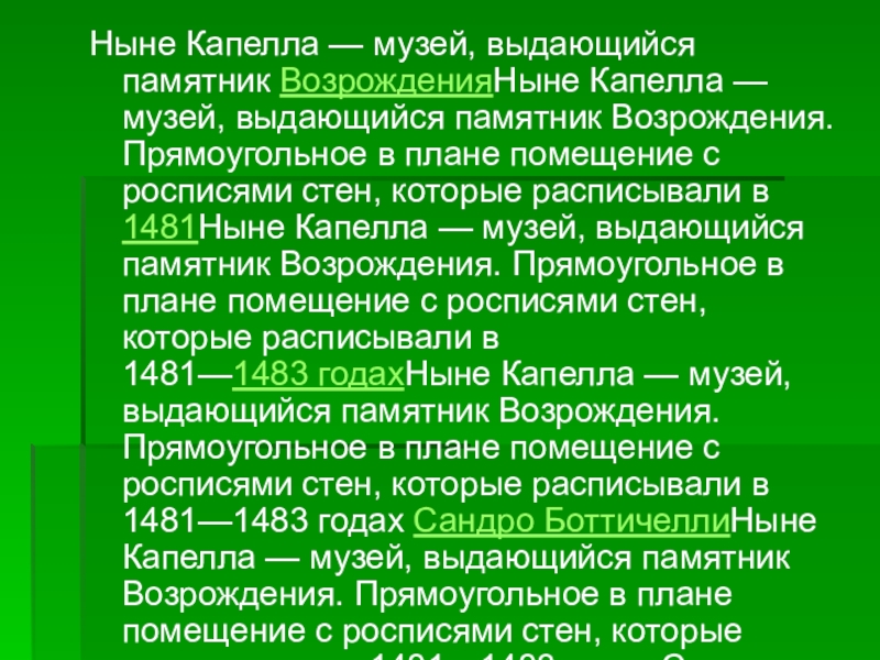 Прямоугольное в плане помещение с росписями стен, которые расписывали в 1481Ныне Капелла — музей, выдающийся памятник Возрождения. Прямоугольное в плане помещение с росписями стен, которые расписывали в 1481—1483 годахНыне Капелла — музей, выдающийся памятник Возрождения. Прямоугольное в плане помещение с росписями стен, которые расписывали в 1481—1483 годах Сандро БоттичеллиНыне Капелла — музей, выдающийся памятник Возрождения. Прямоугольное в плане помещение с росписями стен, которые расписывали в 1481—1483 годах Сандро Боттичелли, ПинтуриккьоНыне Капелла — музей, выдающийся памятник Возрождения. Прямоугольное в плане помещение с росписями стен, которые расписывали в 1481—1483 годах Сандро Боттичелли, Пинтуриккьо и другие мастера по заказу Сикста IVНыне Капелла — музей, выдающийся памятник Возрождения. Прямоугольное в плане помещение с росписями стен, которые расписывали в 1481—1483 годах Сандро Боттичелли, Пинтуриккьо и другие мастера по заказу Сикста IV. В 1508Ныне Капелла — музей, выдающийся памятник Возрождения. Прямоугольное в плане помещение с росписями стен, которые расписывали в 1481—1483 годах Сандро Боттичелли, Пинтуриккьо и другие мастера по заказу Сикста IV. В 1508—1512 годахНыне Капелла — музей, выдающийся памятник Возрождения. Прямоугольное в плане помещение с росписями стен, которые расписывали в 1481—1483 годах Сандро Боттичелли, Пинтуриккьо и другие мастера по заказу Сикста IV. В 1508—1512 годах МикеланджелоНыне Капелла — музей, выдающийся памятник Возрождения. Прямоугольное в плане помещение с росписями стен, которые расписывали в 1481—1483 годах Сандро Боттичелли, Пинтуриккьо и другие мастера по заказу Сикста IV. В 1508—1512 годах Микеланджело расписывал свод с люнетами и распалубкамиНыне Капелла — музей, выдающийся памятник Возрождения. Прямоугольное в плане помещение с росписями стен, которые расписывали в 1481—1483 годах Сандро Боттичелли, Пинтуриккьо и другие мастера по заказу Сикста IV. В 1508—1512 годах Микеланджело расписывал свод с люнетами и распалубками, по заказу папыНыне Капелла — музей, выдающийся памятник Возрождения. Прямоугольное в плане помещение с росписями стен, которые расписывали в 1481—1483 годах Сандро Боттичелли, Пинтуриккьо и другие мастера по заказу Сикста IV. В 1508—1512 годах Микеланджело расписывал свод с люнетами и распалубками, по заказу папы Юлия IIНыне Капелла — музей, выдающийся памятник Возрождения. Прямоугольное в плане помещение с росписями стен, которые расписывали в 1481—1483 годах Сандро Боттичелли, Пинтуриккьо и другие мастера по заказу Сикста IV. В 1508—1512 годах Микеланджело расписывал свод с люнетами и распалубками, по заказу папы Юлия II. А в 1536Ныне Капелла — музей, выдающийся памятник Возрождения. Прямоугольное в плане помещение с росписями стен, которые расписывали в 1481—1483 годах Сандро Боттичелли, Пинтуриккьо и другие мастера по заказу Сикста IV. В 1508—1512 годах Микеланджело расписывал свод с люнетами и распалубками, по заказу папы Юлия II. А в 1536—1541 годахНыне Капелла — музей, выдающийся памятник Возрождения. Прямоугольное в плане помещение с росписями стен, которые расписывали в 1481—1483 годах Сандро Боттичелли, Пинтуриккьо и другие мастера по заказу Сикста IV. В 1508—1512 годах Микеланджело расписывал свод с люнетами и распалубками, по заказу папы Юлия II. А в 1536—1541 годах МикеланджелоНыне Капелла — музей, выд