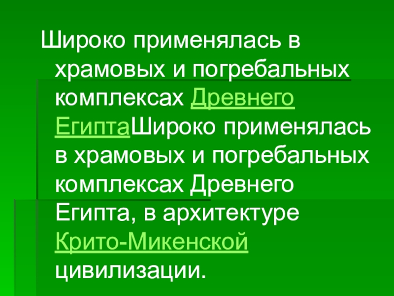 Широко применялась в храмовых и погребальных комплексах Древнего ЕгиптаШироко применялась в