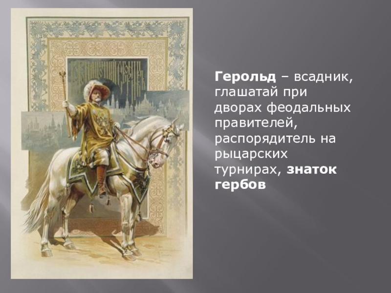 Слайд 8Герольд – всадник, глашатай при дворах феодальных правителей, распорядитель на рыцарских