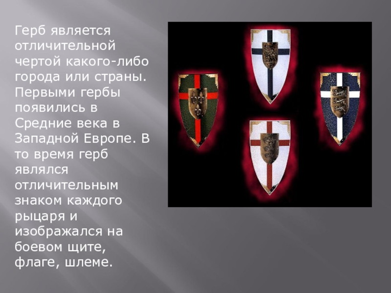 в Средние века в Западной Европе. В то время герб являлся отличительным знаком каждого рыцаря и изображался на боевом щите, флаге, шлеме.