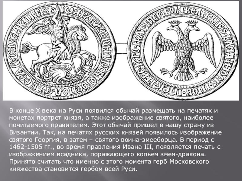 и монетах портрет князя, а также изображение святого, наиболее почитаемого правителем. Этот обычай пришел в нашу страну из Византии. Так, на печатях русских князей появилось изображение святого Георгия, в затем – святого воина-змееборца. В период с 1462-1505 гг., во время правления Ивана III, появляется печать с изображением всадника, поражающего копьем змея-дракона. Принято считать что именно с этого момента герб Московского княжества становится гербом всей Руси.